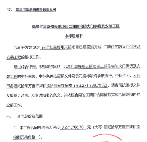 近日,,,,洪都消防凭借丰富的项目经验、、、强大的产品实力和良好的信誉,,,,在营销中心领导的带领下团结一致齐心协力,,顺利中标远洋集团远洋红星赣州天铂项目防火门及安装工程项目,,,,项目总额327万元。。