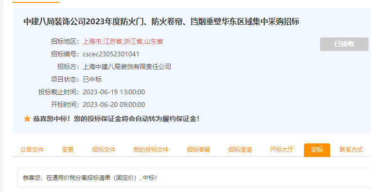 | 喜讯:洪都消防中标中建八局装饰公司2023年度防火门、、、、防火卷帘、、、挡烟垂壁华东区域集采 发布时间:2023年7月27日 浏览次数:1476次 |